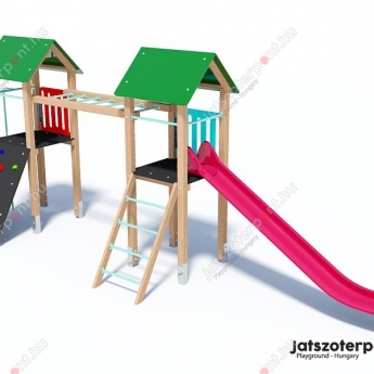 Ez a játszóvárunk két magas toronyból áll, amelyet lajhármászó köt össze. A tornyokra fel, illetve azokból lejutni mászó rámpán, létrán, tűzoltócsövön, vagy csúszdán lehetséges. A játszóvár alá ütéscsillapító réteg telepítése szükséges.