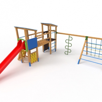 A játék része két torony, az egyik tornyon helyeztünk el egy csúszdát, egy mászó falat,, illetve a torony “alsó szintjén egy OXO amőba logikai játékot. A másik torony része egy függőleges mászó fal színes mászó kövekkel, egy tűzoltórúd. A torony harmadik oldalán van egy függőleges mászó létra acél cső fokokkal. A két tornyot egy láncos egyensúlyozó híd köti össze . A dupla tornyos szerkezetből indul ki a mászóka kombináció, melyen található egy hullámos mászórúd, illetve egy ferde mászó háló, és egy ferde létra mászóka.