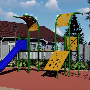 Megérkezett ÚJDONSÁGUNK , FÉM termékcsaládunk első darabja ! Igyekeztünk szem előtt tartani a sok éves tapasztalatok alapján hogy játszható legyen az eszköz , de közben meg is feleljen a kor dizájnjának. Úgy gondoljuk ebben a termékben sikerült ezeket ötvözni. A Két torony között egy kötél híd található , míg a tornyokba a feljutást háló, mászó fal, és kígyó , és sima létra biztosítja. A lejutásban az örök barátunk egy csúszda nyújt segítséget!