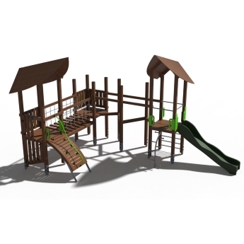 Három tornyú birodalomunkat az erdő ihlette ! Minden tornyot összekötöttünk , hol egy cikk-cakk átjáróval, hol egy láncos egyensúlyozóval. A feljutásban egy íves "tűzoltő létra " segít, egy íves mászó fal , és egy klasszikus létra segít! A lejutást egy csúszda biztosítja .