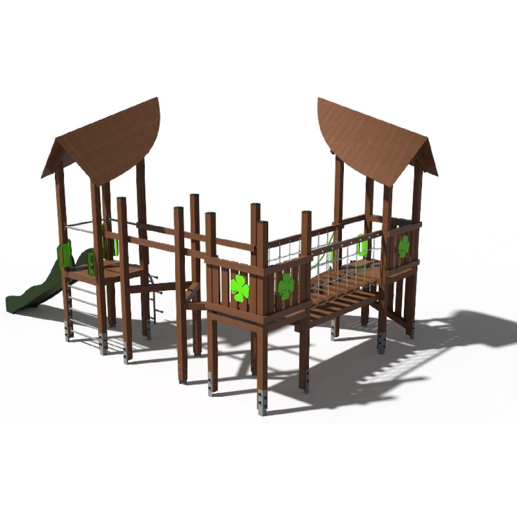 Három tornyú birodalomunkat az erdő ihlette ! Minden tornyot összekötöttünk , hol egy cikk-cakk átjáróval, hol egy láncos egyensúlyozóval. A feljutásban egy íves "tűzoltő létra " segít, egy íves mászó fal , és egy klasszikus létra segít! A lejutást egy csúszda biztosítja .