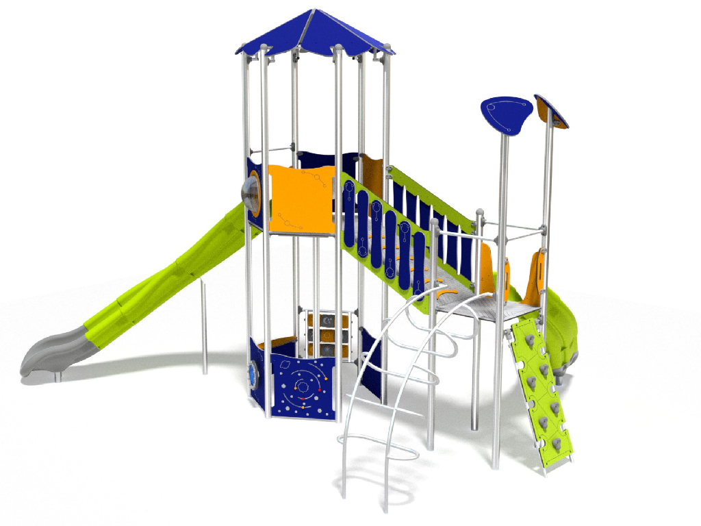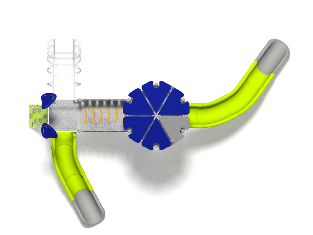 INOX óriás hexagon torony bástyával ferde híddal és íves létrával.
