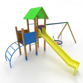 Eme játszóvárunk egy fő toronyból s egy mellette található bástyából áll. A toronyba hagyományos létra biztosítja a feljutást, míg a bástyára egy íves létra . A toronyból csúszdán lehet lejutni. S mindehhez csatoltunk egy fészekhintát.