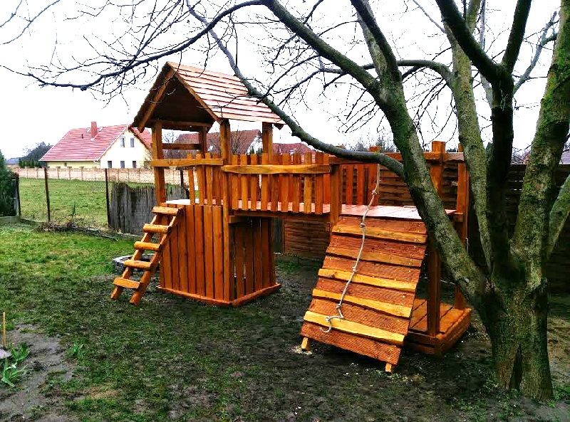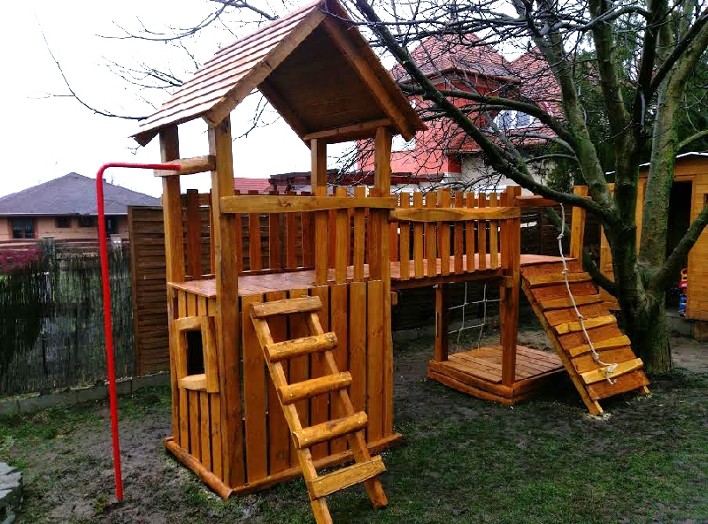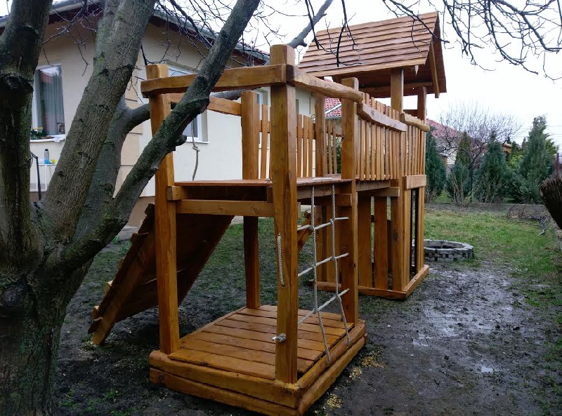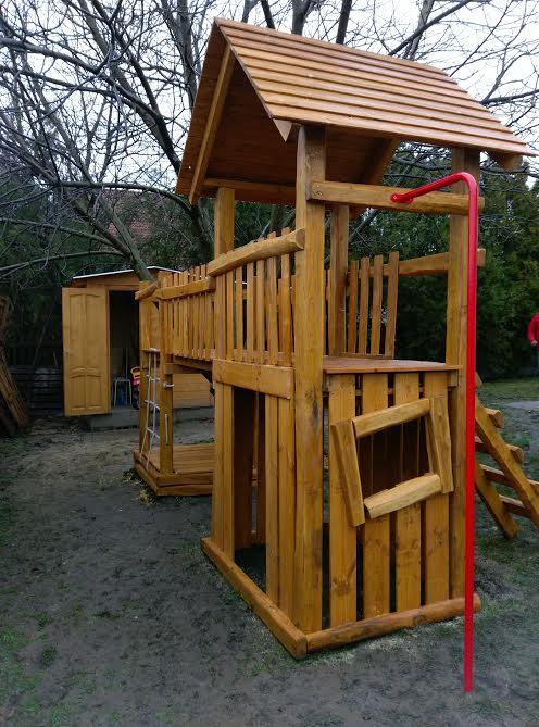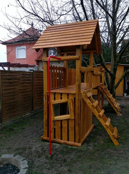 Fatetős kuckós nagy tornyunk tűzoltó csővel szereltük és egy mászó hálós, mászó falas bástyát összekötöttünk egy fahíddal, így egy komplett dupla tornyos játszóvárat kaptunk, amin több csemete tud akár egész nap játszani!