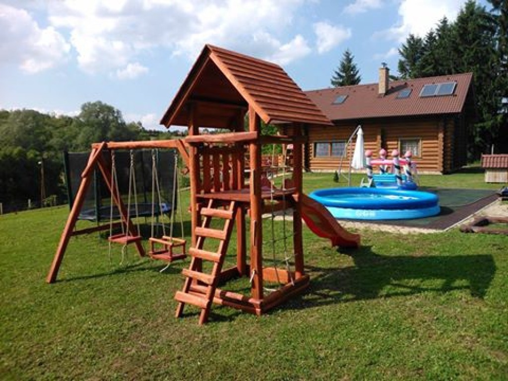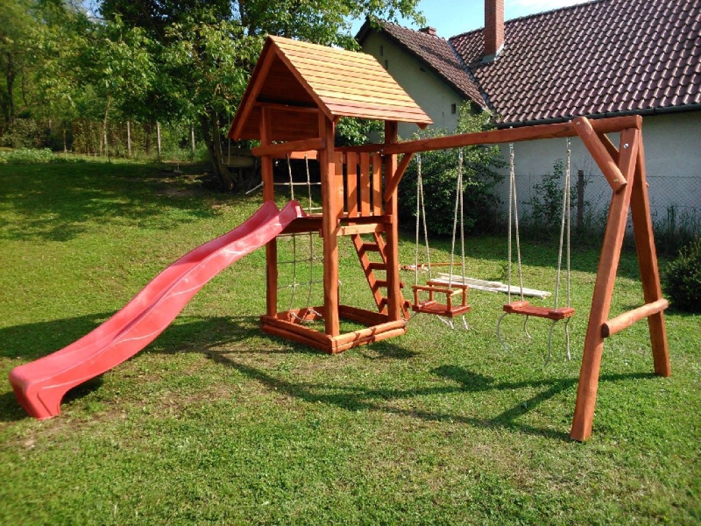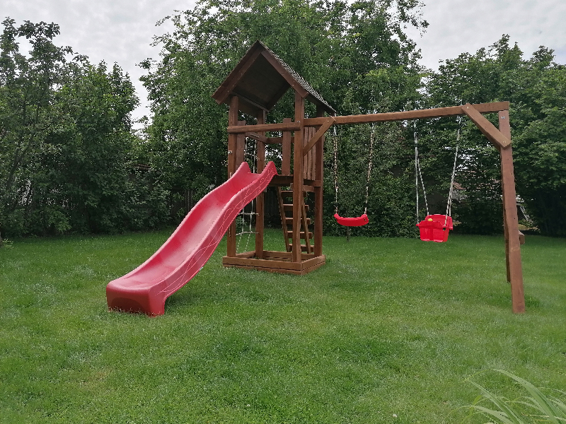 Homokozós kis torony fa fedéllel , hintákkal, mászóhálóval.