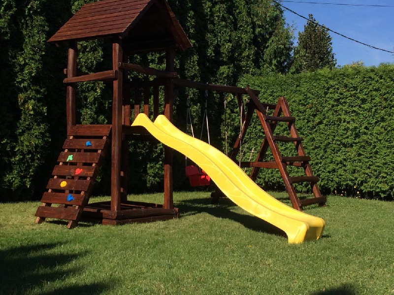 Ez a komplett játszóterünk, fafedeles tornyot foglal magában, amire létrával és mászó fallal lehet feljutni.