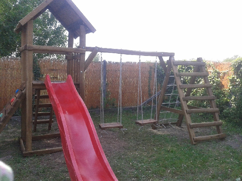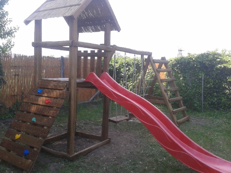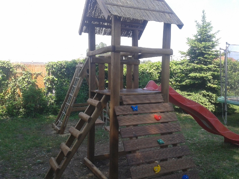 Ez a komplett játszóterünk, nádfedeles tornyot foglal magában, amire létrával és mászó fallal lehet feljutni.