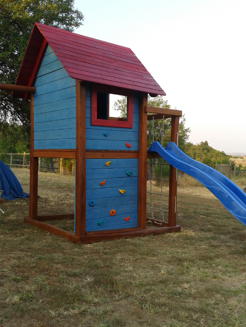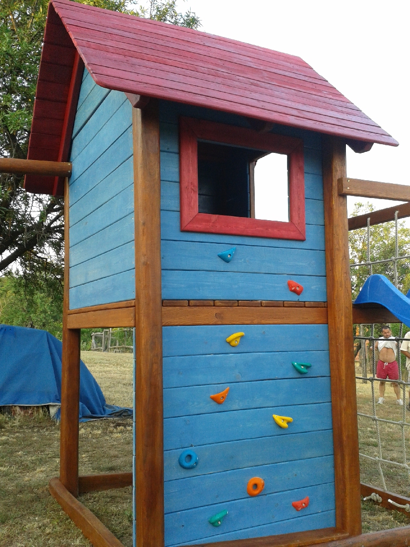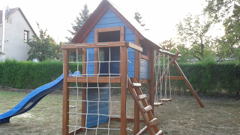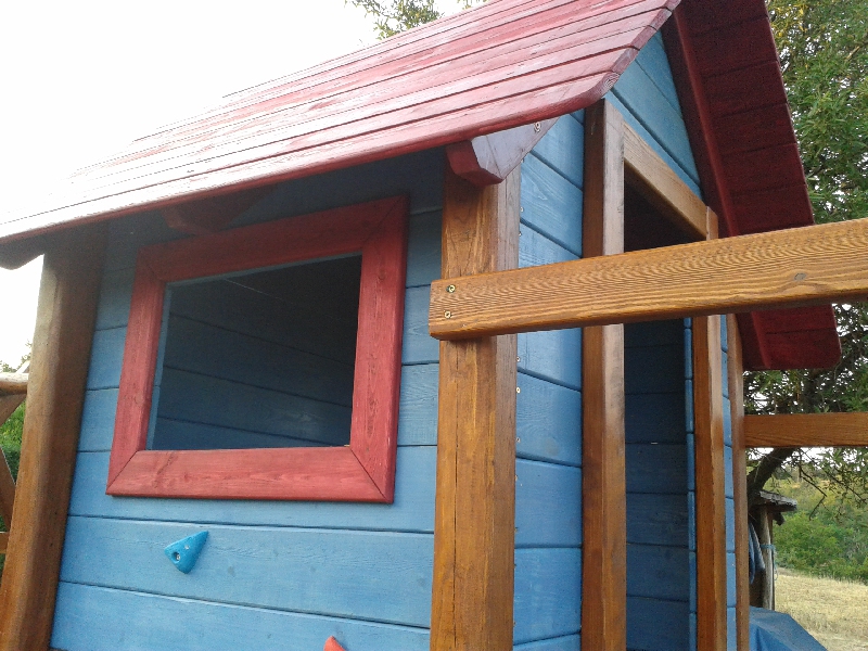 Fa tetővel szerelt , a toronyhoz kapcsolódik egy erkély, melyről egy csúszda viszi le a gyermekeket . Feljutni a toronyba , létrán illetve mászó hálón lehet!