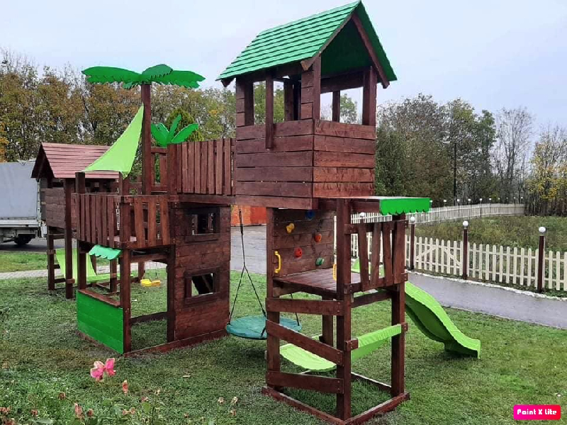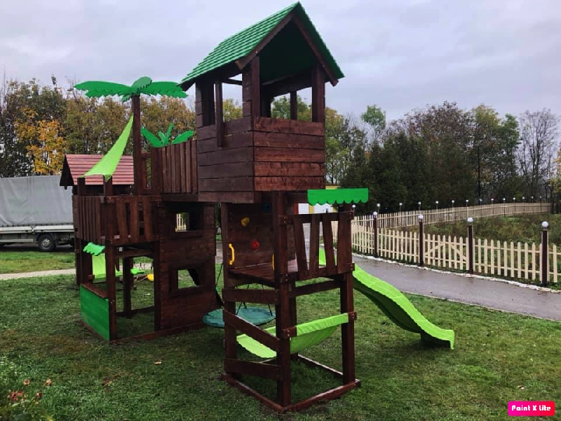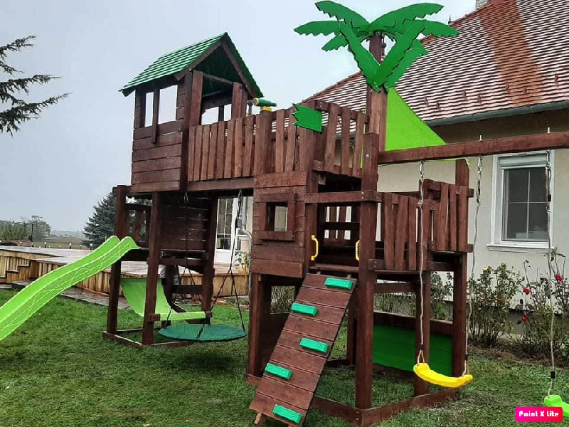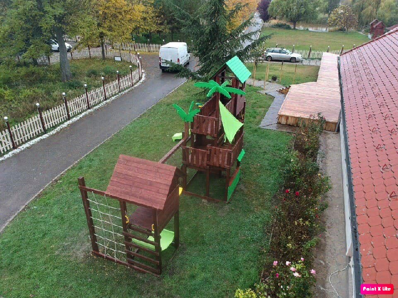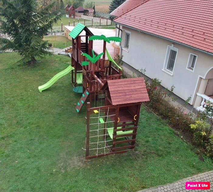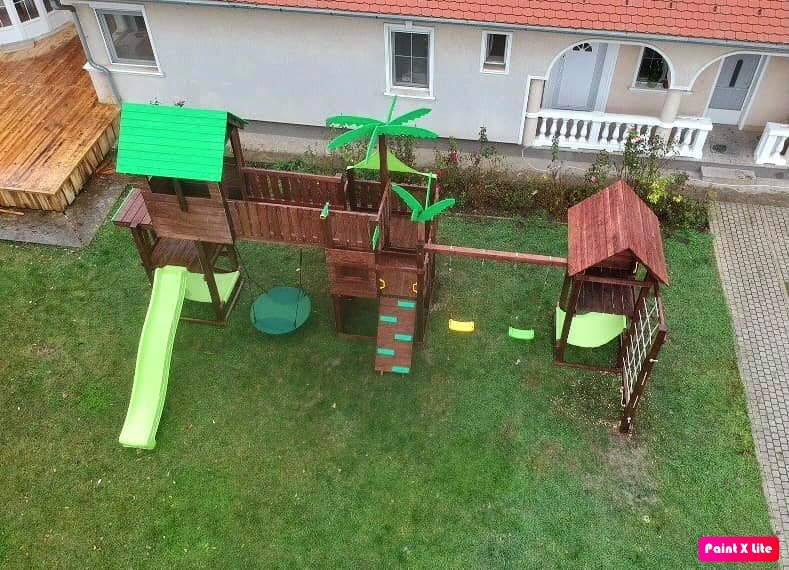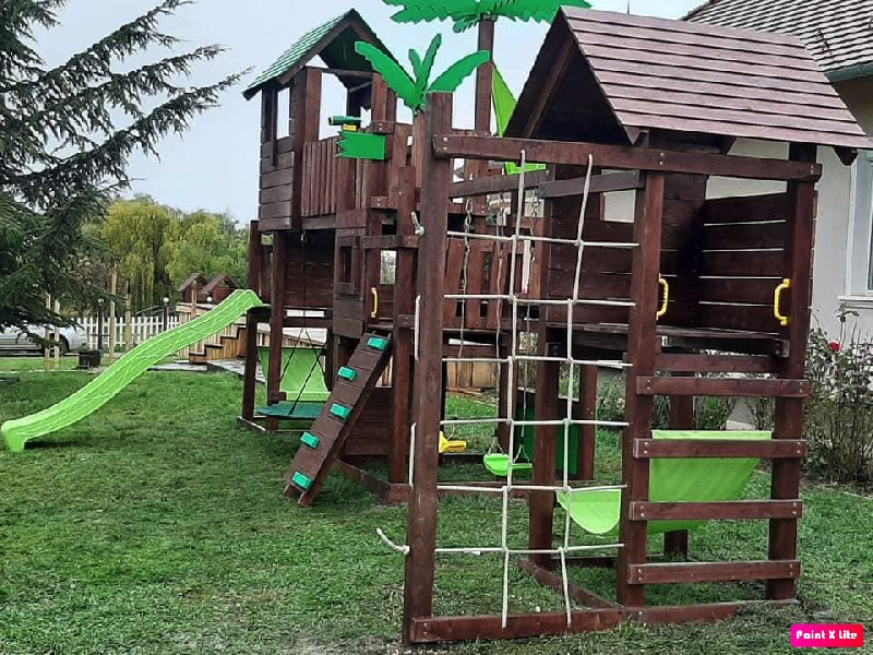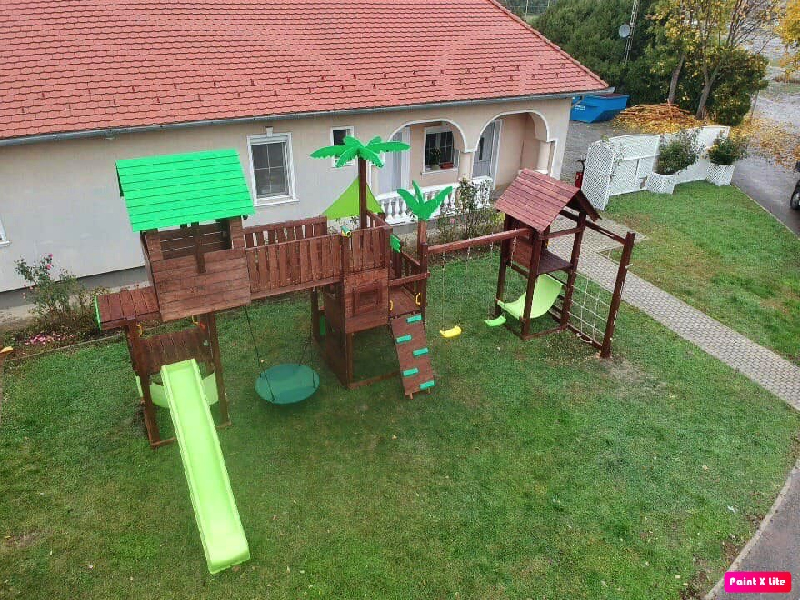 fészekhintát, nyugágyakat , napvitorlát, és egy többszintes központi tornyot, melyet megmászva feljuthatunk a 3. szintre és az ott található távcsőre körbe nézhetünk , és megpihenhetünk a torony - kuckóba.