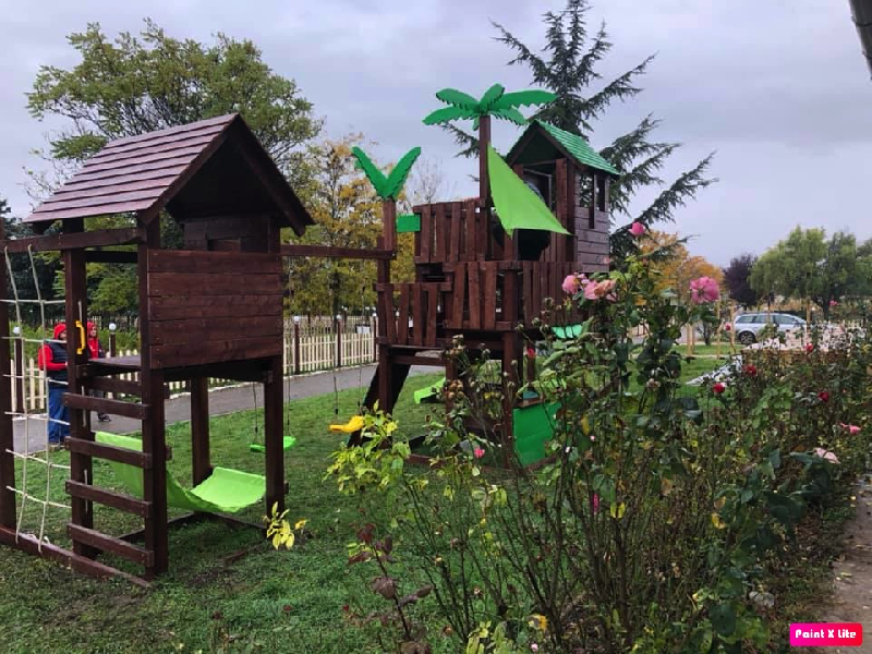 A megszokott csúszdán , mászó falon, kötél hálón és hintán kívül, már találhatunk benne