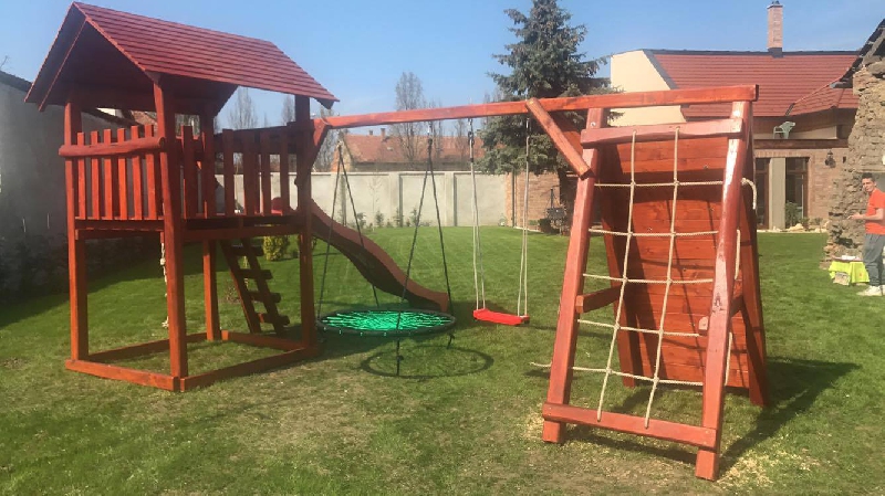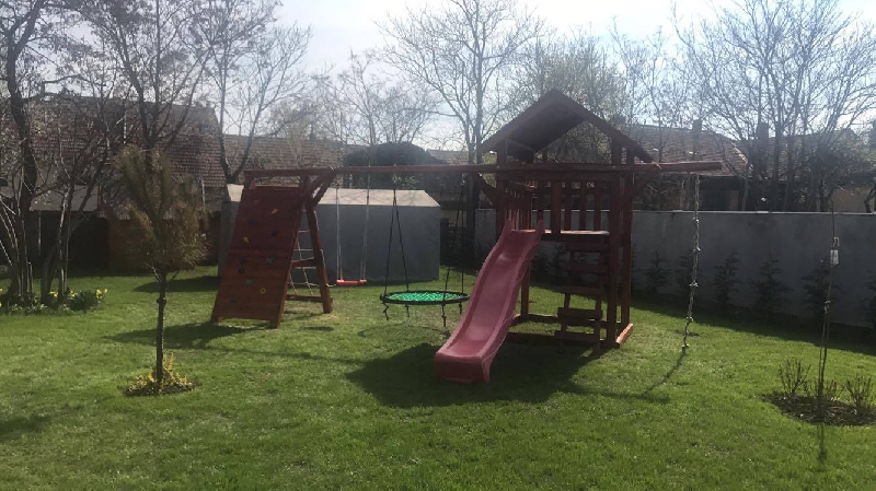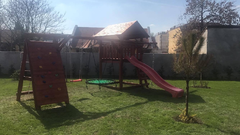 A toronyhoz kapcsoltunk egy hinta rudat amire egy fészek hinta került s egy tetszőlegesen választható lap vagy baba hinta. A rúd végére pedig egy óriás mászó falalt s mászó hálót építettünk.