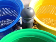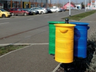 három darab 1 mm-es perforált acéllemezből készült, szelektív hulladékgyűjtésre alkalmas edény, tűzihorganyozás után porfestve
